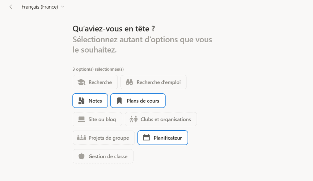 Rendez vous sur la page d’accueil de Notion, ensuite cliquer sur « Get Notion Free ». Vous aurez alors à faire un choix entre 3 options, choisissez « Pour les études », ensuite « Continuer ». Une fois chose faite, vous aurez l’écran suivant: